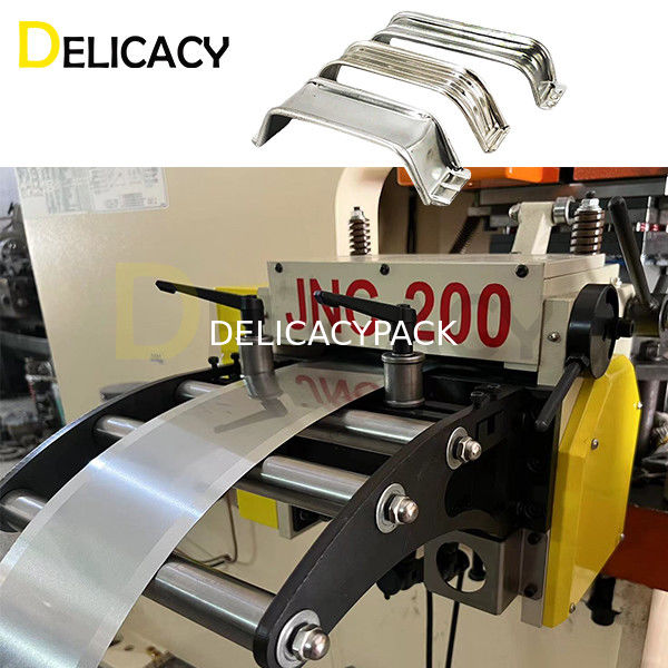 Prosesnya biasanya dimulai dengan gulungan bahan baku, yang dimasukkan ke dalam mesin yang membentuk bahan menjadi bentuk pegangan.Gagang kosong kemudian dipotong dengan ukuran yang sesuai dan diangkut ke mesin berikutnya, di mana mereka dibengkokkan dan dibentuk agar pas dengan bagian atas kaleng persegi panjang 4L.
